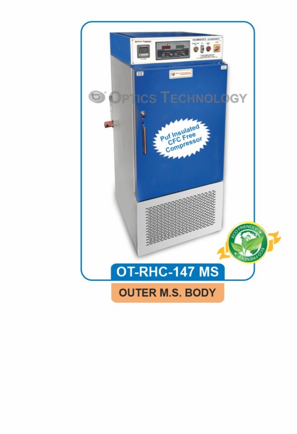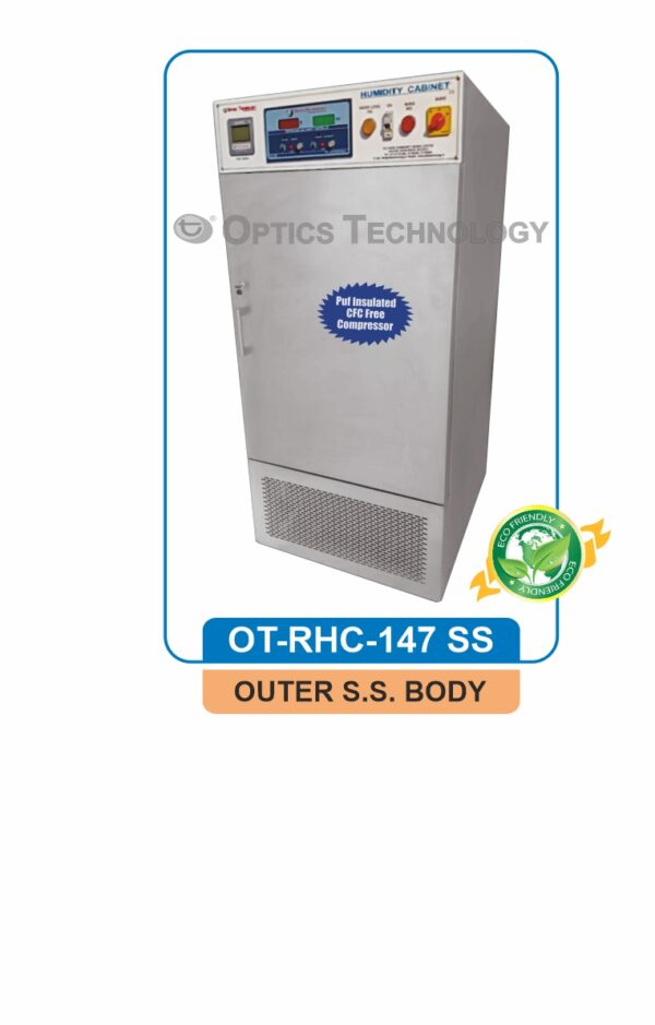 Gap between the walls is filled with special PUF Insulation. Temp. & Humidity is controlled by Digital Temp. & Humidity Controller and Digital volt meter. Atmospheric conditions are created within the chamber. Humidity is created in a S.S. Water Reservoir fitted at the back to provide 40% to 95% ± 3% RH Humidity. Complete with Cord & Pulg to work on 220 Volts A.C.